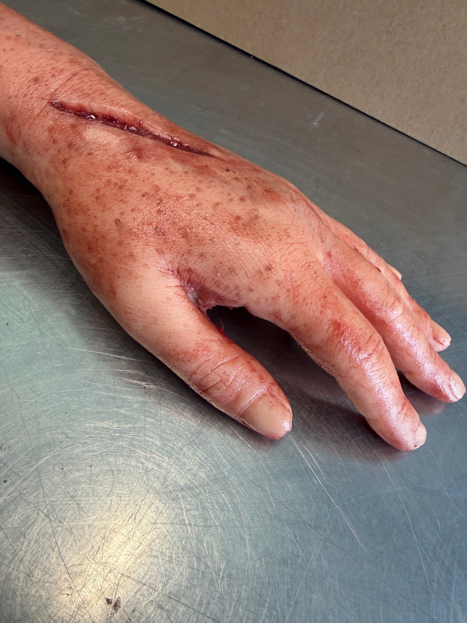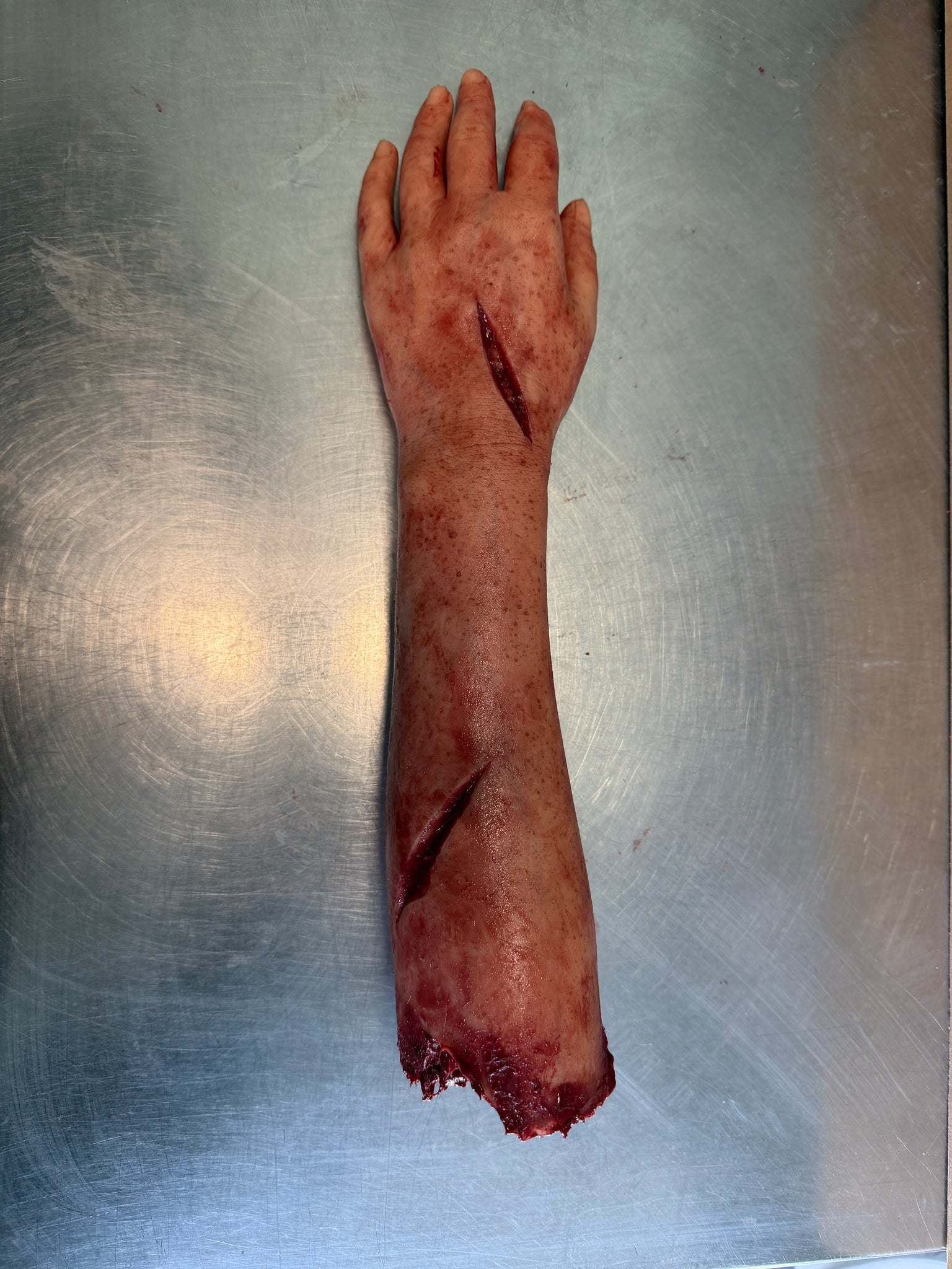 Silicone female severed arm. Hand is solid silicone and from the wrist to nub is silicone skin with a foam core. Highly detailed and individually made so each one is unique with scarring and blood splatter. Allow two to three weeks for production.